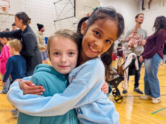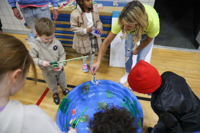 The excitement continued in the gym, where students explored a variety of academic-themed games, including Ring Toss with high-frequency words, Math Ring Toss, Fishing for Words, Tic Tac Toe Bonanza, the Brain Builders Booth, Spin and Solve, Phoneme Plinko, Math Plinko, and the Wheel of Rhymes. Families moved from station to station collecting stamps, solving challenges, and working together.