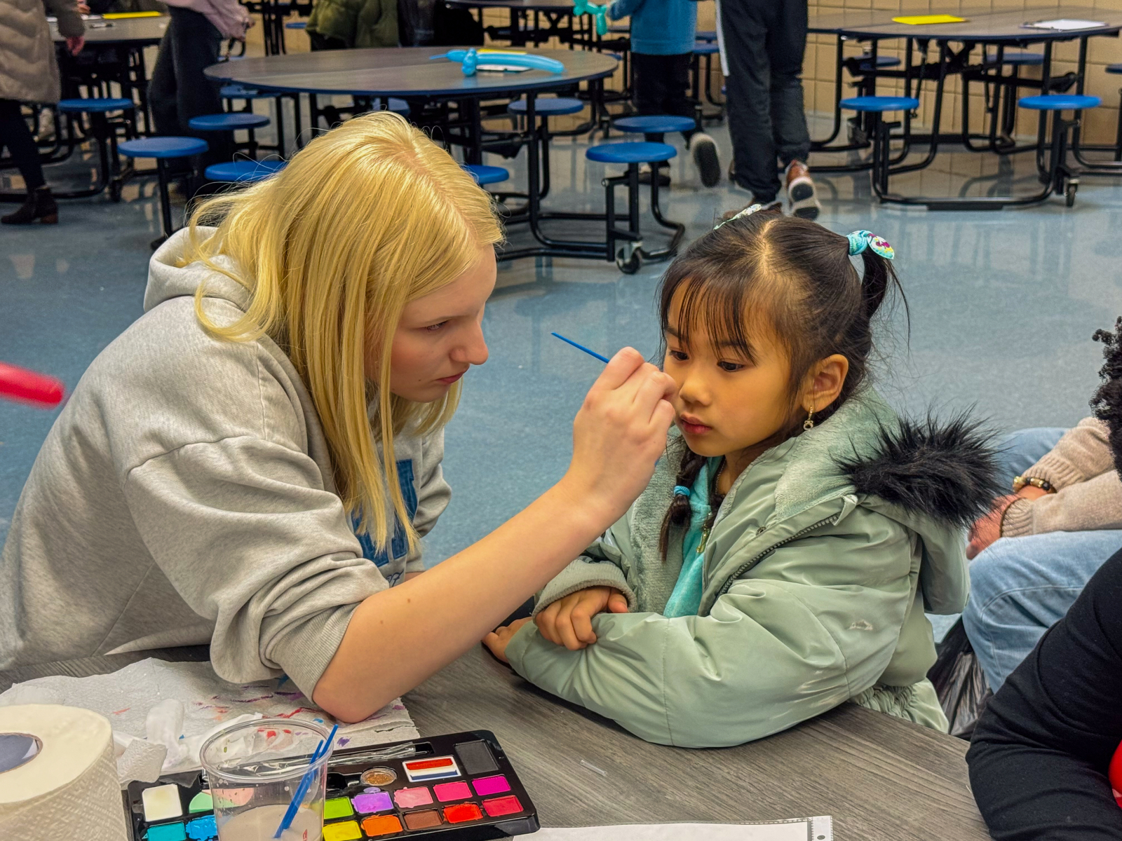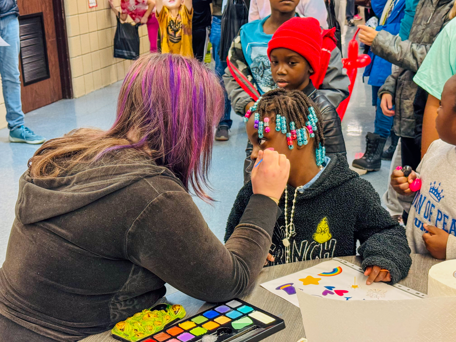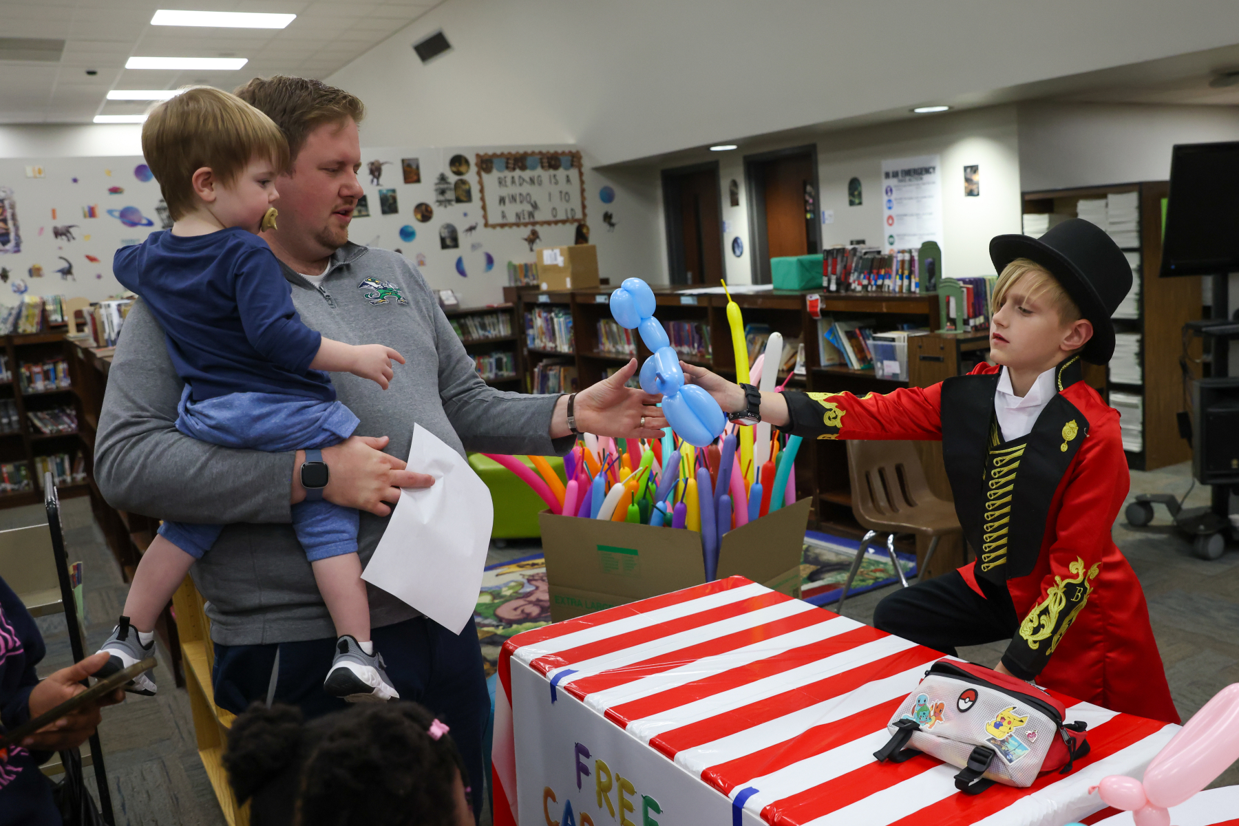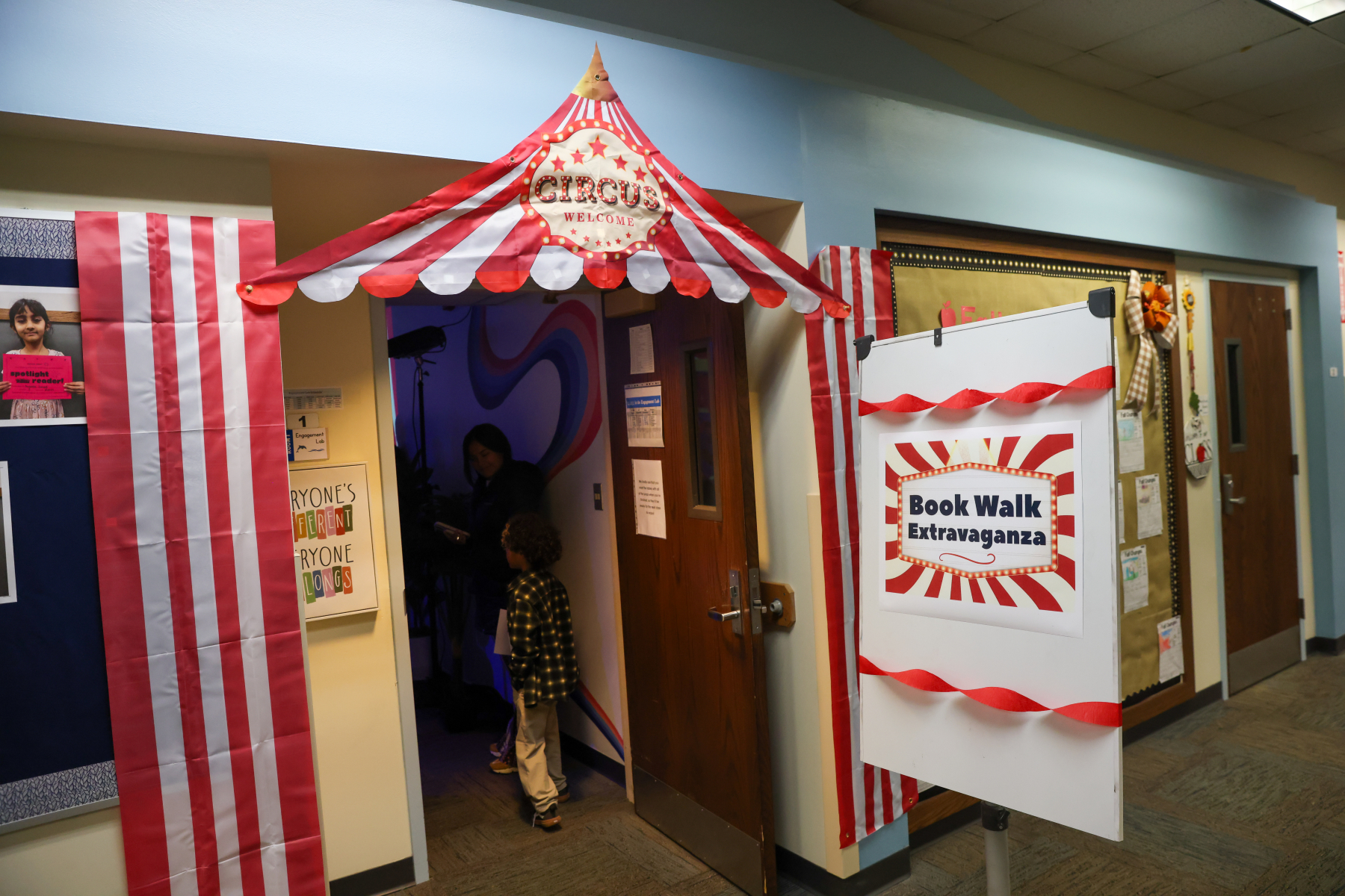 In the Library, students enjoyed balloon creations and entered a free game giveaway. The Cafeteria offered a snack station and face painting, while the Engagement Lab featured a Book Walk that kept students moving and reading. In the hallway outside the cafeteria, families stopped by the Center Stage Snapshots photo booth for a fun keepsake picture.