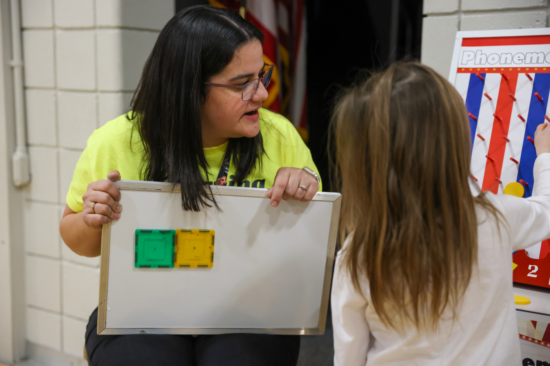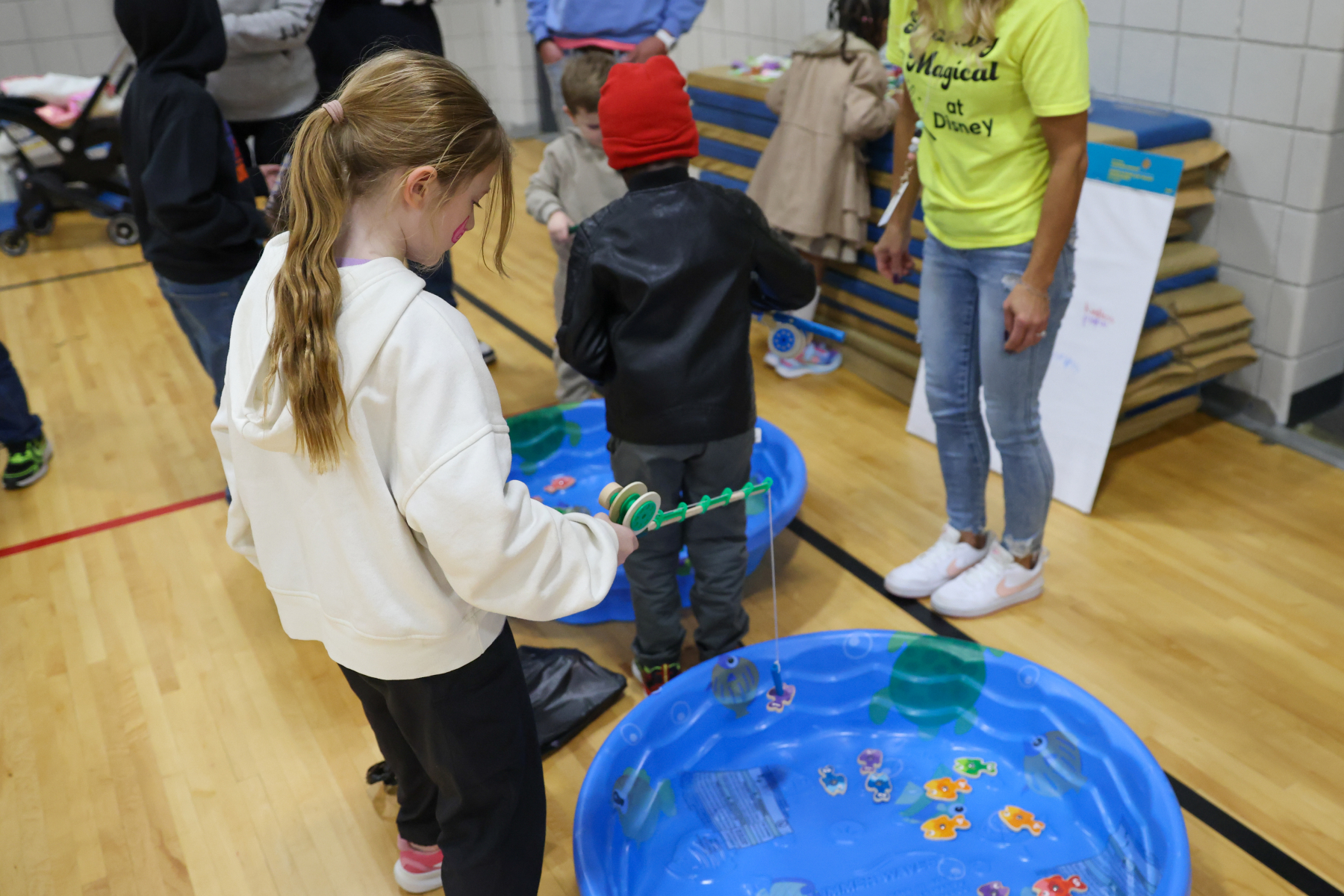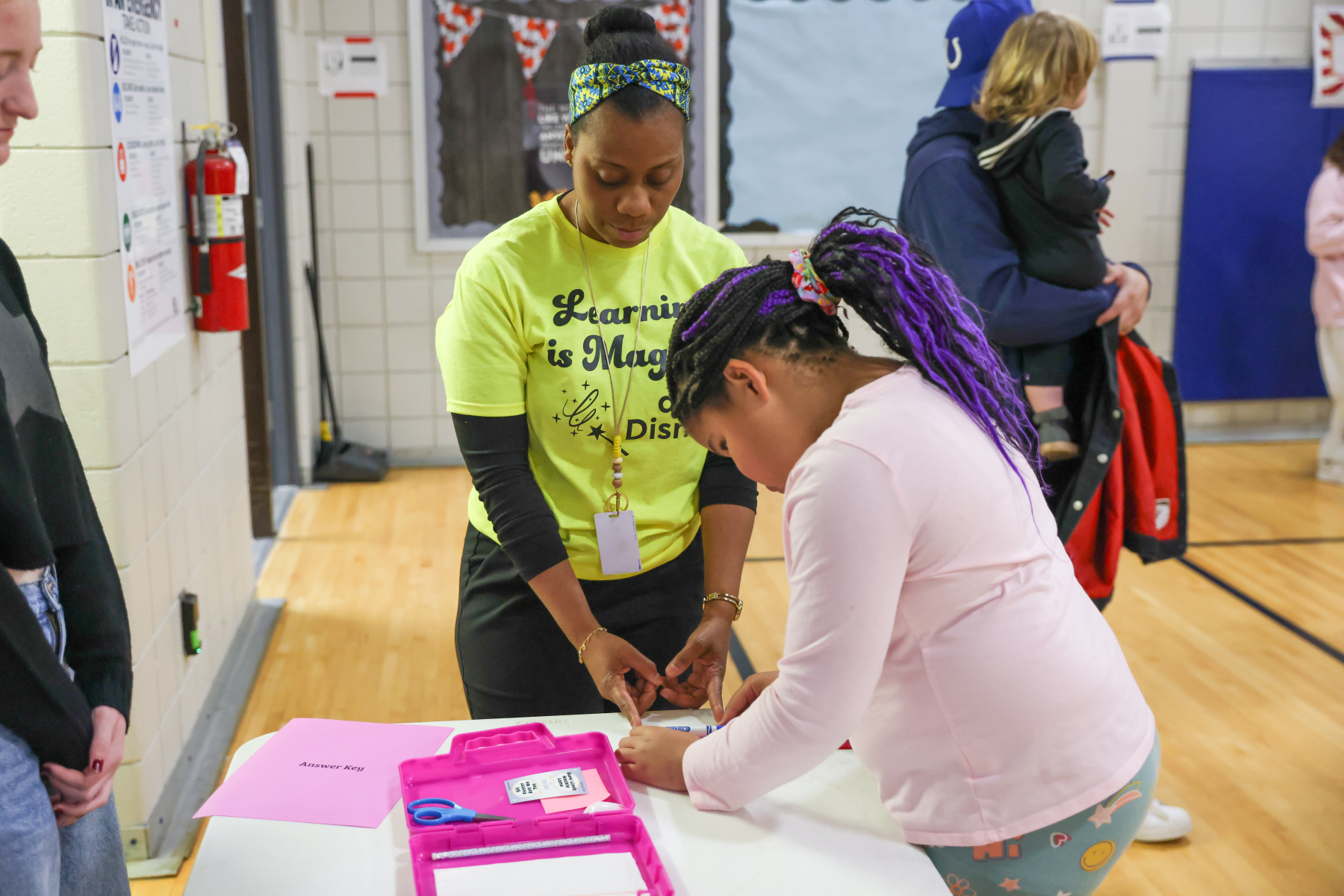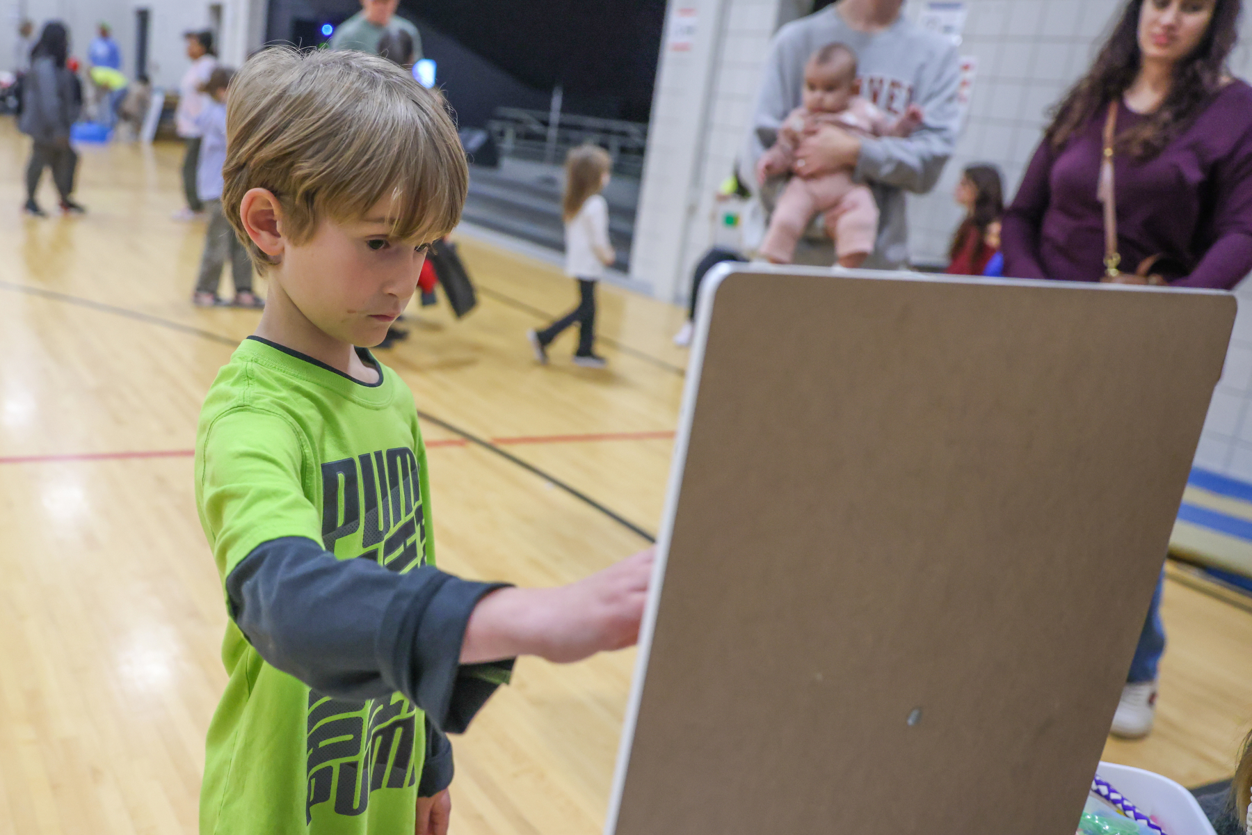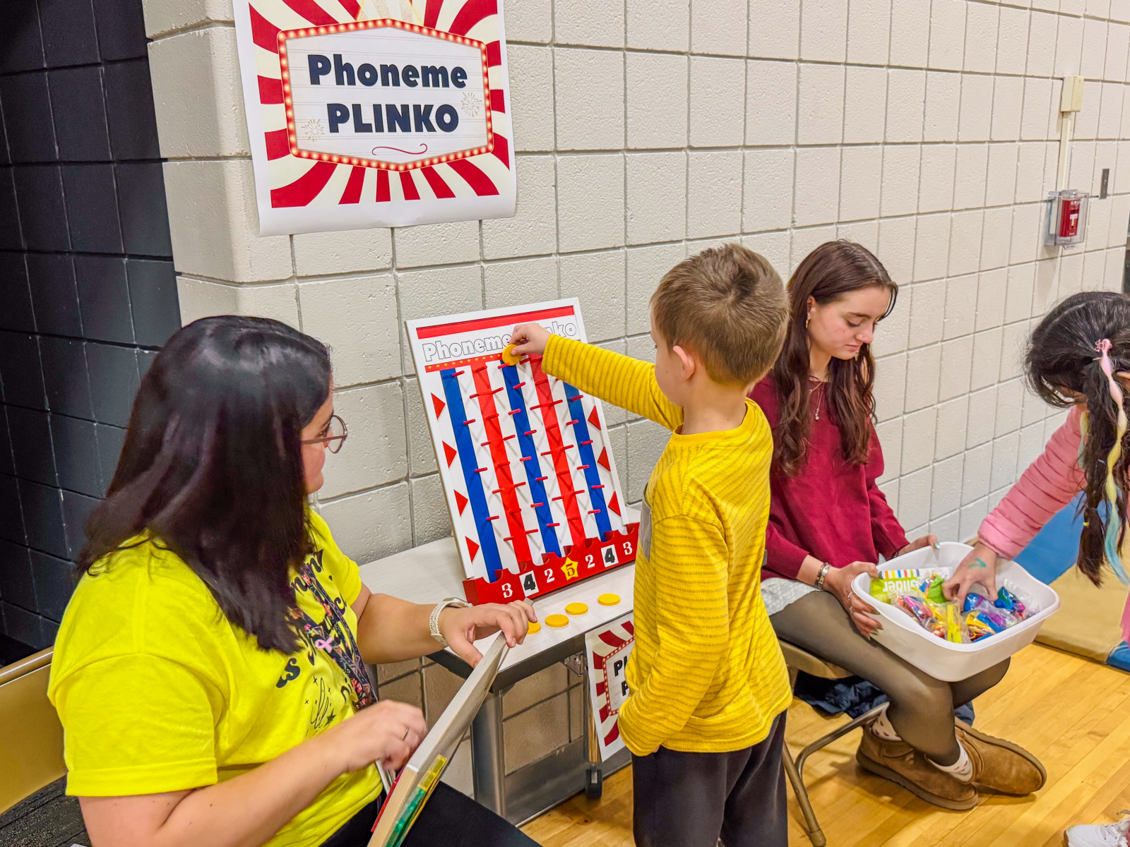 The excitement continued in the gym, where students explored a variety of academic-themed games, including Ring Toss with high-frequency words, Math Ring Toss, Fishing for Words, Tic Tac Toe Bonanza, the Brain Builders Booth, Spin and Solve, Phoneme Plinko, Math Plinko, and the Wheel of Rhymes. Families moved from station to station collecting stamps, solving challenges, and working together.
